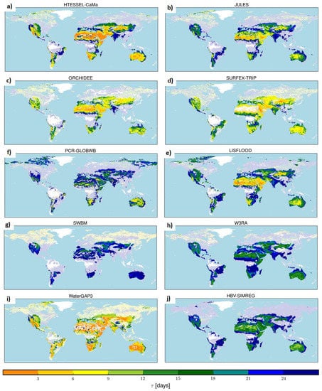Water Resources Reanalysis 1 (WRR1) model’s characterization of drydown events. The maps (a–j) show values of median τ (days) for all identified drydown events in each grid cell, and for the different models (stated on top of each map). Areas that show more than one dry event per year by the models are highlighted with deeper color shades (shades as shown in the color bar). Note that the values over bare soil dominated regions are not supported by the theory used here that only affects vegetated areas, however, the values still show the lifetime parameter of a hypothetical exponential decay of soil moisture.