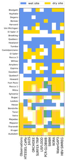Results of the dry/wet site identification at the 35 FLUXNET sites by observations and models. Colored squares represent the fraction of events of 10 or more days of no precipitation that are considered as dry events; blue color indicates Ndry/Ntotal ≤ 0.25 (wet site), yellow color indicates Ndry/Ntotal ≥ 0.5 (dry site), and white color indicates 0.25 < Ndry/Ntotal < 0.5.