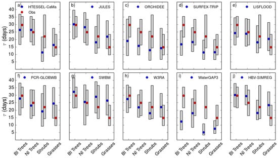 Drydown rates grouped by plant functional type for observations (red dots) and models (blue dots). The plant functional type representing each event is adopted as reported by the site in the case of observations or dominant at the grid cell in the case of models (see Figure 5). Dots indicate the median τ from identified drydown periods; bottom and top of grey boxplots indicate the 25th and 75th percentiles, respectively. Panels (a–j) correspond to comparisons between observations and the 10 models analysed (model indicated in panel legend). Savanah sites (Table 1) are identified as shrubs in this comparison.