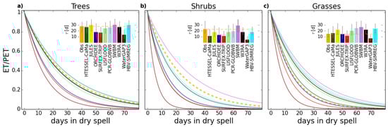 Hypothetical drydowns using the median τ from identified dry periods by the observations (dashed orange line) and WRR1 models (continuous lines). Data grouped by vegetation cover: (a) trees, (b) shrubs, and (c) grasses. Inset bar charts represent the median τ values and error bars represent the interquartile range. Note that whereas the number of drydown events that the median τ represents for the observations is low and very similar for the three vegetation covers (56 for trees, 48 for shrubs, and 56 for grasses), in the case of models, the number of events is much higher and relatively low for shrubs as they are dominant over a smaller fraction of the globe, according to Figure S2 (of the 105 of events per model for trees and grasses and 104 for shurbs).