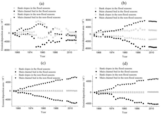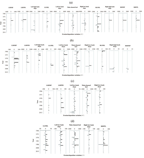 4.2.2. Erosion/Deposition of Different Geomorphic Units in Channel Cross-Sections