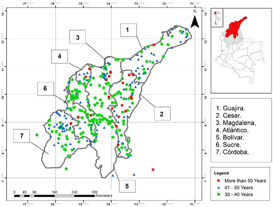 The Caribbean region of Colombia is comprised of seven political and administrative territorial units (called departments), namely Guajira, Magdalena, Cesar, Atlántico, Bolívar, Sucre, and Córdoba, which sum up a total area of 132,244 km2 (accounting for approximately 0.012% of the country’s total surface area). It has an average annual precipitation that ranges from 0–1500 mm (the region’s northern portion) and from 1500 mm up to 5000 mm (in some areas of the southern portion of the departments of Bolívar and Córdoba) [4]. The region is mostly composed of plains, with the exception of the mountain ranges of San Jacinto (located within the departments of Sucre and Bolívar) and Santa Marta (department of Magdalena). The rainiest departments are Bolívar and Sucre, while the driest is Guajira. The average annual temperature is about 30 °C with some areas where it may increase or decrease depending on the climatological season and altitude. The rainfall climate regime of the Colombian Caribbean region has three seasons [24]: dry (December–March), transition—also known as Veranillo de San Juan—(June–July), and rainy (April–June and August–November). The duration of these seasons is affected by the El Niño Southern Oscillation (ENSO) phenomenon [25,26,27,28,29].