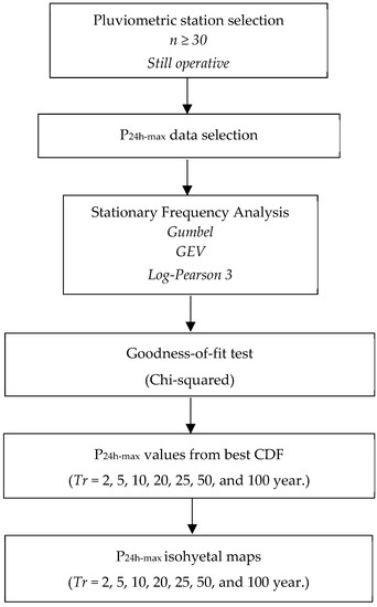 After having initially selected the pluviometric stations and the P24h-max data, further data analysis was required, which is explained in the next sub-sections. Figure 2 depicts the flowchart of the methodology proposed. The preprocessing (pluviometric station selection and P24h-max data selection) for the rainfall data selection was already explained in the previous section.