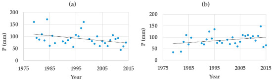 Scatter plots of the multiannual series of P24h-max of each rain gauge revealed that there might be regionalization of the daily maximum rainfall trends within the departments that need to be further explored and analyzed, as it was observed that rainfall observations showed a noticeable increasing or decreasing trend line over time, which may indicate (a) a change in the rainfall pattern due to, among others, anthropogenic factors and (b) that a non-stationary frequency analysis is more suitable for the rainfall data of those rain gauges at a local level [66,67]. Figure 3 shows the scatter plot and the trend lines of the rain gauges Puerto Giraldo and Los Campanos located in the department of Atlántico.