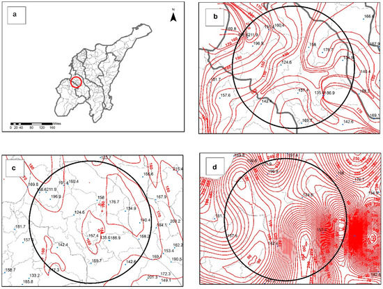 (a) Area showing isohyetal alignment discrepancies; (b) isohyetal IDW method; (c) isohyetal ordinary kriging method; (d) isohyetal spline method.