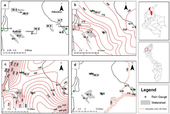In addition to the visual inspection, the accuracy of all generated maps (by each of the interpolation methods) to estimate P24h-max values for a given return period was evaluated in eight watersheds with various area sizes and located at different distances from neighboring rain gauges. Five watersheds are located in the northern part of the department of Bolívar. Watersheds 1, 2, and 3 (W-1, W-2, and W-3) are close to the rain gauges Bayunca, Cañaveral, and Escuela Naval-CIOH, respectively. The rain gauges Bayunca and Cañaveral are located within Watersheds 4 and 5 (W-4 and W-5). Furthermore, three watersheds (W-6, W-7, and W-8) located in the vicinity of the rain gauge Loma Grande (department of Atlántico) were selected to validate the performance of the isohyetal methods in areas with nearby rain gauges not included in this study (Loma Grande had less than thirty years of observations). Table 7 summarizes the watersheds’ area and distance from the centroid to the nearest rain gauge. Figure 5 depicts the location and the isohyetals at each of the watersheds for a 100-year return period.