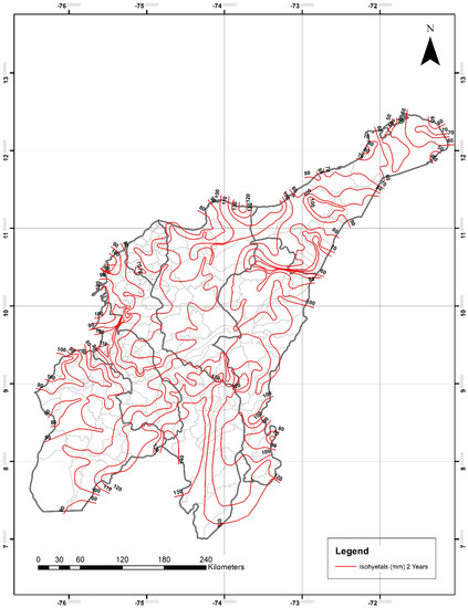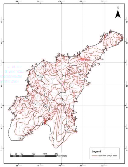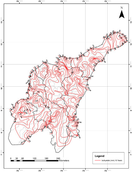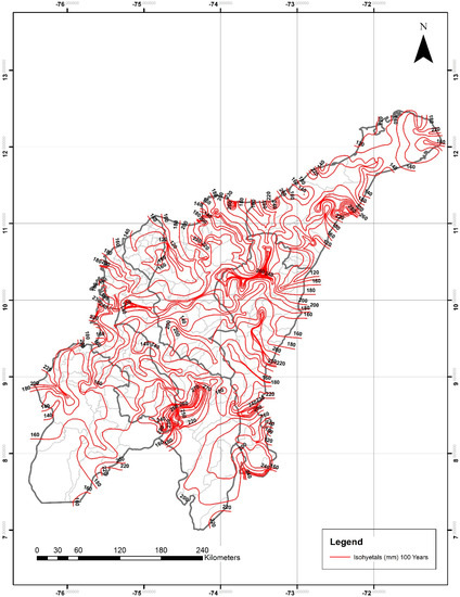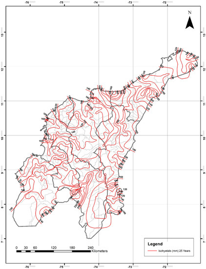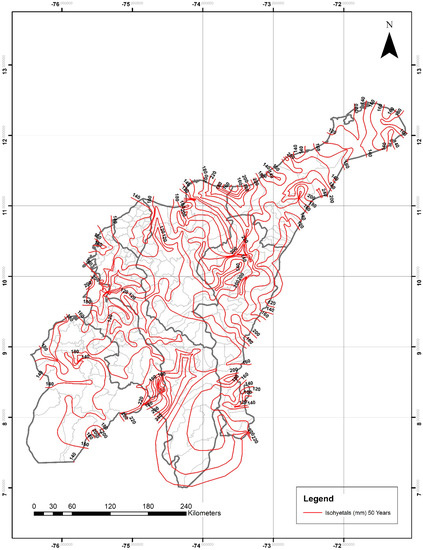 For the department of Cesar, P24h-max isohyetals ranged from 80–120 mm for two years, 90–150 mm for five years, 100–170 mm for 10 years, from 120–180 mm for 20 years, 120–200 mm for 25 years, from 120–220 mm for 50 years, and from 120–260 mm for 100 years. The lowest and highest values were observed in the northeastern and southern areas, respectively.
