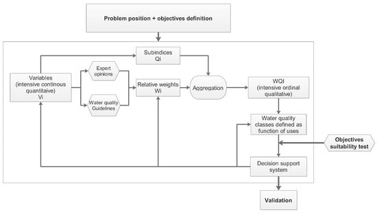 The objective of the is to classify the waters relative to biological, chemical and physical characteristics defining their possible uses and managing their allocations [,,]. To this end, the analytical variables must be weighted and aggregated.