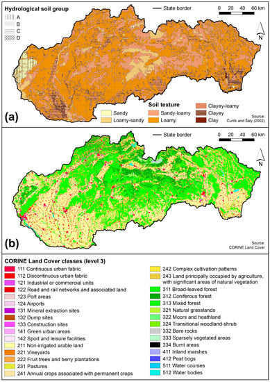 Curve numbers (CN) were calculated using the SCS-CN method [42] and HEC-GeoHMS extension for ArcGIS software. Hydrological soil groups and land cover data represented the inputs for the calculation of CN. The map of hydrological soil groups [43] was created based on the Soil Texture Map 1:500,000 [44] while land cover data were derived from the CORINE land cover (CLC level 3) database for the year 2018 [45]. With the use of the SCS-CN table [43,46] and based on the map of hydrological soil groups as shown in Figure 5a, and the map of land cover as shown in Figure 5b, the resulting CN grid was obtained and reclassified into five classes according to the runoff potential of CN [47].