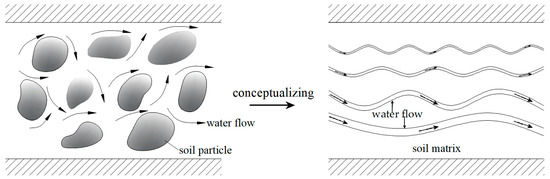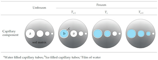 The real size or geometric shape of pores are difficult to describe, meaning pores are sometimes visualized as circular capillary tubes [30]. A capillary bundle model has consequently been proposed and frequently applied [31,32,33]. Although the model is different from real soils, it contains many of the same properties and so can be used to analyse the water flow in frozen soil [18]. As illustrated in Figure 1, the pores are conceptualised as an assembly of tortuous capillary tubes.