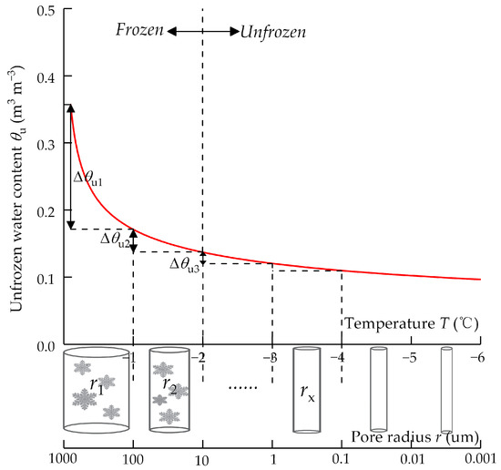 where is the film thickness of unfrozen water () and, is the Hamaker constant, . The soil freezing curve (SFC) describes how the volumetric content of unfrozen water decreases with a decrease in the sub-zero temperature. The number of capillaries of radius can be determined using the SFC. As shown in Figure 3, the SFC is divided into several different spaced water-content intervals of width , according to the experimental points, and the temperature associated with the decrease in can be determined. All capillaries of radius are assumed to be frozen when . Thus, the number of capillaries frozen at , is equivalent to the increase in ice content in real soil, , where is the increment of ice volume at . can be calculated from the SFC, then the cumulative number of capillaries is given by summing the number of capillaries of radius when .
