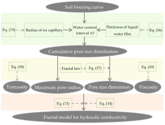 In this model, the porosity is the ratio between the total unfrozen volume of capillaries and the volume of the soil column. As the unfrozen capillaries are assumed to be completely filled with unfrozen water, so the volume of unfrozen water can be conceived as the volume of the capillaries; thus, the porosity is equivalent to the volumetric content of unfrozen water. To illustrate the fractal hydraulic conductivity modeling process well, a flow diagram is given in Figure 4.