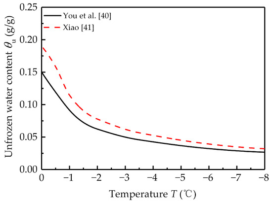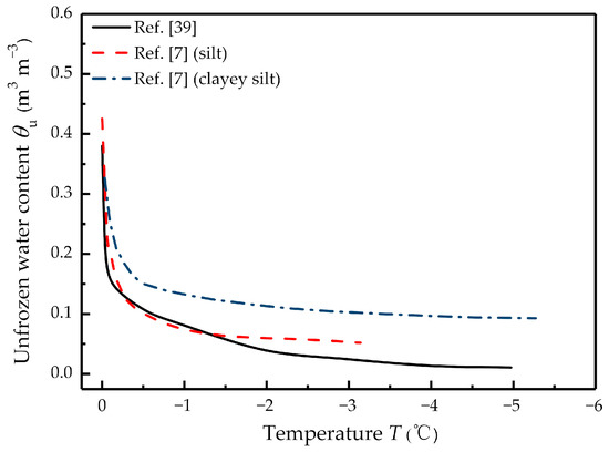 The SFC was used to determine pore size distribution in the present study. To verify this method, MIP was compared with this method. You et al. [40] and Xiao [41] measured the pore size distribution of silty clay using MIP. Figure 11 represents the SFC of the two soil samples. The solid line represents the freezing curve of You et al. [40], and the dashed line represent that of Xiao [41].