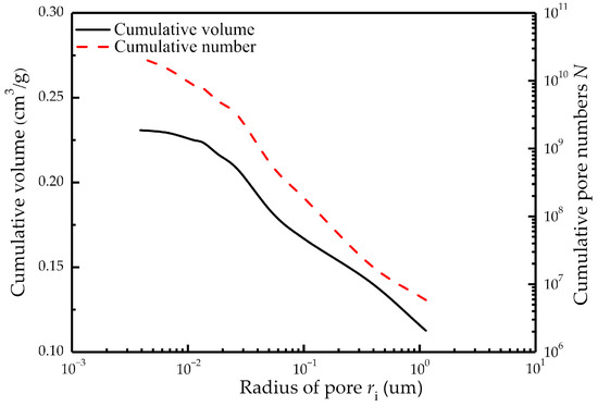 Equation (5) gives the pore number between the pore size and . In Equation (5), , which indicates that pore number decreases with an increase in pore size.