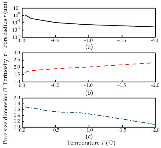 Figure 7a shows the relationship between the maximum pore radius and temperature, which was calculated by Equations (15) and (16). The maximum pore radius decreased with temperature. Figure 7b gives the relationship between the tortuosity and temperature, obtained using Equation (19). The tortuosity increased with temperature. Figure 7c presents the relationship between the pore size dimension and temperature, which was computed from the cumulative pore size distribution using Equation (17). The pore size dimension decreased linearly with temperature. As shown in the figure, the three parameters all varied with temperature, which caused the hydraulic conductivity to be affected by the temperature according to Equation (13).