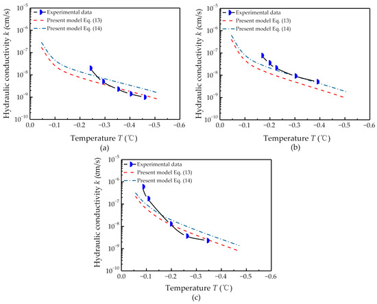 In the same way, the hydraulic conductivities of the three soil samples were predicted by the present model for different temperature and volumetric water content from Equation (13). The results are shown in Figure 8c,d. From Figure 8c, the hydraulic conductivity changed dramatically within −1 °C, with similar results observed by Burt et al. [7] and Miller et al. [8]. These results can be explained by the fact that the decrease in temperature caused a decrease of the pore size and pore size dimension and increase of the tortuosity as shown in Figure 7, leading to a decrease in the hydraulic conductivity. Figure 8d shows the relationship between the hydraulic conductivity and volumetric water content, calculated from Equation (13). Figure 8d shows that the hydraulic conductivity increases with an increased in unfrozen water content.