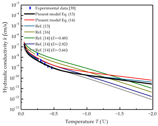 In contrast, the fractal model provided a good agreement with the hydraulic conductivity data overall. Moreover, comparison with other models revealed the following advantages of the fractal model: fewer parameters; parameters are easy to obtain; each of the parameters has a clear physical meaning; and no measured conductivity is required in the model. Additionally, the fractal model can explain the reason for hydraulic conductivity changing with temperature; however, the influence of frost heave on the pore structure of frozen soil is not considered in the model, which may result in underestimating of the experimental data.