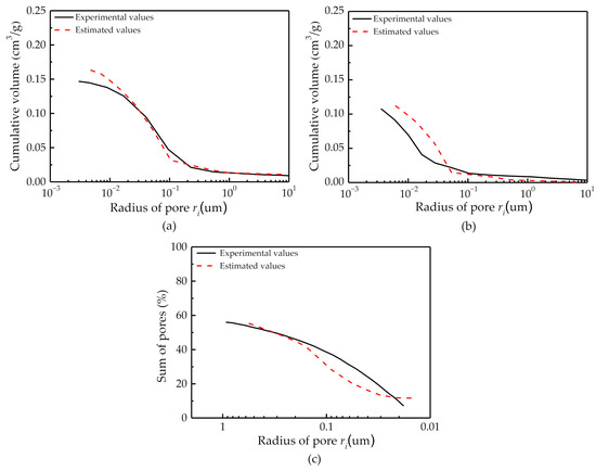 Figure 12 shows the comparison of pore size distribution determined by the SFC and MIP. The solid lines represent the pore size distribution determined by MIP and the dashed lines represent the pore size distributions determined by the soil freezing curve. It can be seen that the pore size distribution determined by the SFC captured the distinctive feature of the pore size distribution determined by MIP well; however, this method overrated the smaller pores measured by MIP. This result could be ascribed to the fact that the isolated pores—those that had no communication with the exterior of the sample could not be measured by MIP in any event, regardless of the pressure used [42], However, the isolated pores could be filled with water, which is considered in the pore size distribution determined by the SFC. Fagerlund [37] used a similar method to accurately predict the pore size distribution in the range 0.02 µm~0.5 µm for a certain sand-lime brick as shown in Figure 12c.
