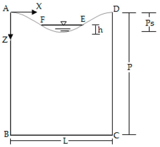 Solution domain for two-dimensional Richards’ equation. Z is the vertical spatial coordinate, X is the horizontal spatial coordinate, P is the soil depth profile, PS is the furrow depth and h is the water depth in furrow center. A, B, C, D, E and F are frontier points of solution domain used to define border conditions.