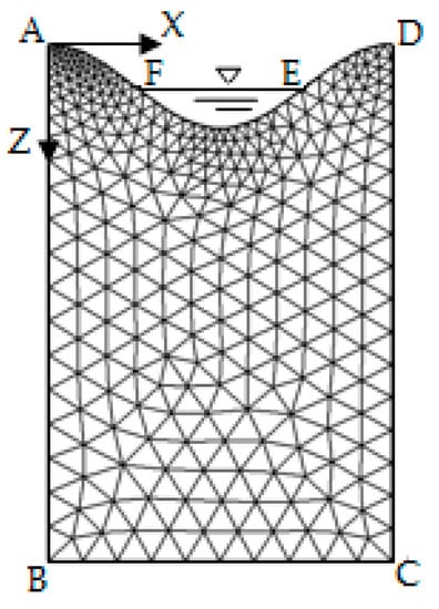 The cross section of the furrow had the following dimensions: a width of 100 cm, and a depth of 150 cm; in the upper zone of the domain, the shape of the furrow obtained with Equation (3) was introduced.