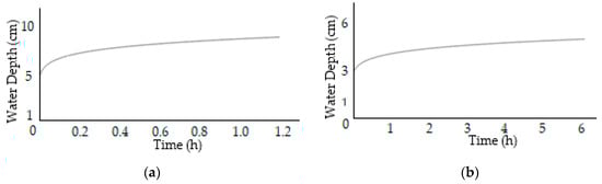 To solve two-dimensional Richards’ equation numerically, it is necessary to know time–water depth evolution in furrow. Accepting the contact time hypothesis [] allows proposing a unique form of time–water depth evolution in furrow throughout its length as a first approximation. The internal numerical coupling of the Saint-Venant and Richards’ equations for border irrigation was done by using a Eulerian–Lagrangian method based on [], where the water depth over the soil was obtained by the numerical solution of the full Saint-Venant equations for mass and momentum conservation, while the infiltrated water depth was calculated by the finite element solution of the two-dimensional Richards’ equation. For a given border length, the Christiansen Uniformity Coefficient (CUC) was evaluated for a varied water intake flow. It was found that the CUC was very sensitive to the water intake flow; the water intake flow that corresponded to a maximum CUC was denominated optimal intake flow. The process was repeated for several lengths of a border and was found that a basically lineal relationship exist between the optimal intake flow and the border length. This last process was done for ten soil types of the texture triangle of USDA. Table 3 presents these values relative to three soil types, including optimal intake flow and the corresponding irrigation time. If use is made of a hydraulic resistance flow law of potential form [], then the normal water depth for a border is obtained, which is transformed to an equivalent normal water depth for a furrow. Figure 3a–c exposes the evolution of equivalent furrow water depth at the beginning of the furrow, scaled from the evolution of border water depth at the beginning of the border obtained by the application of the described numerical model.