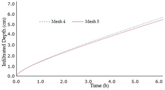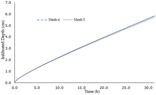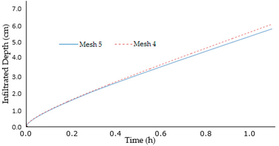 where n is the number of infiltrated depth data pairs, is the infiltrated depth obtained using the denser finite element mesh for a given time and is the infiltrated depth obtained with a different mesh from for the same time step.