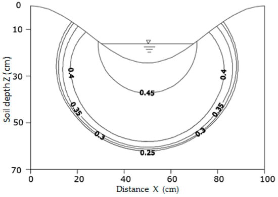 Humidity distribution in silt loam soil, using a typical irrigation time of 6.2 h. cm3/cm3 (100% saturation).
