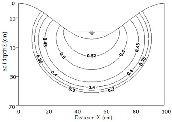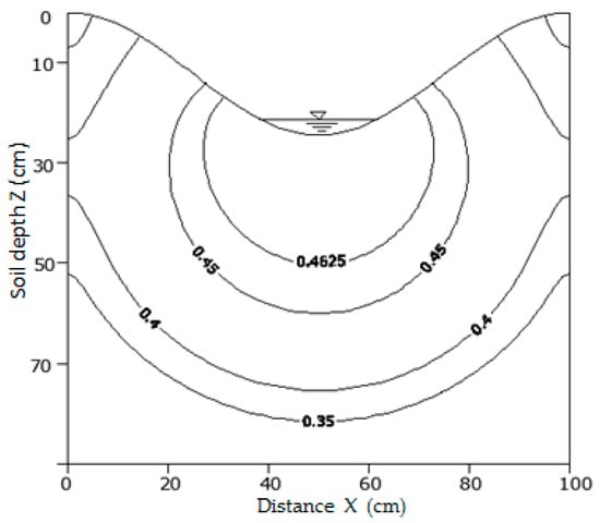 To expand the scope of this study and for a fuller exploration of the subject, the results were compared with results obtained by applying the HYDRUS-2D program [] (Version 2.0, PC-Progress, Prague, Czech Republic). The HYDRUS program numerically solves the two-dimensional Richards’ equation for saturated–unsaturated water flow. HYDRUS implements the soil-hydraulic functions of [], using the statistical pore-size distribution model of [] to obtain a predictive equation for the unsaturated hydraulic conductivity function in terms of soil water retention parameters. The expressions of [] are given as follows:
