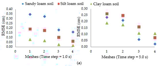 Figure 10a–c shows the values of the RMSE. These correspond to the results of infiltrated depth obtained with mesh 5 combined with meshes 1, 2, 3 and 4. With that combination the maximum error results; any other combination of meshes to determine the RMSE had a lower value than those presented below.