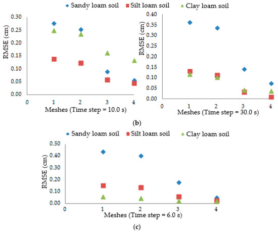 RMSE values comparing infiltrated depth for the three soil textures and five finite element meshes, (a) time steps of 1.0 and 5.0 s; (b) time steps of 10.0 and 30.0 s; (c) time steps of 60.0 s.