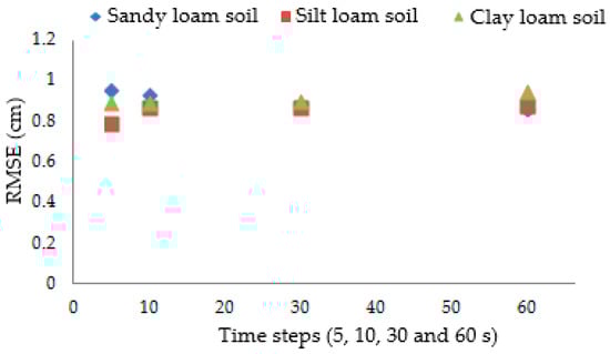Instability of infiltrated depth evolution results for sandy loam soil were evident when time steps were greater than 10.0 s. This result is similar to studies reported in the literature [,].