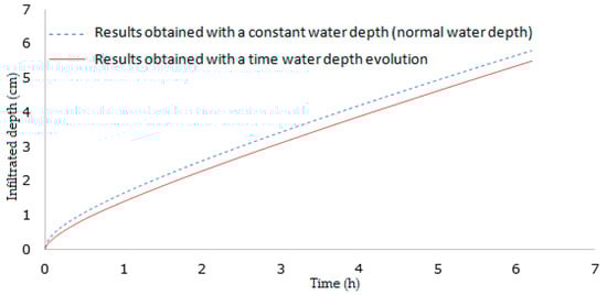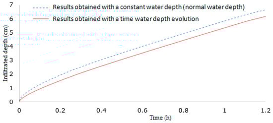 Infiltrated depth evolution for sandy loam soil. The dotted line corresponds to results considering a constant water depth in time (normal water depth). The continuous line corresponds to results considering a variable water depth (proposed in this study). Typical irrigation time of 1.2 h. RMSE = 0.460 cm.