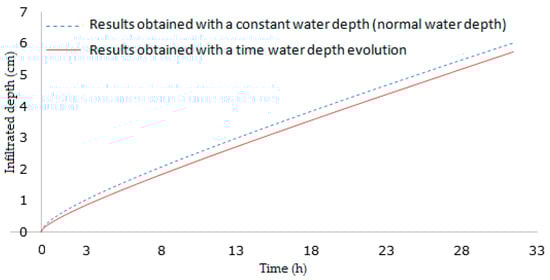 Infiltrated depth evolution for clay loam soil. The dotted line corresponds to results considering a constant water depth in time (normal water depth). The continuous line corresponds to results considering a variable water depth (proposed in this study). Typical irrigation time of 31.4 h. RMSE = 0.267 cm.