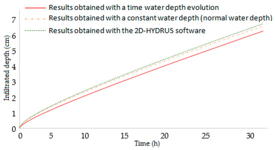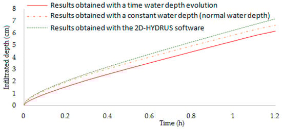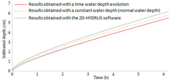 Results shown in Figure 12, Figure 13 and Figure 14 were compared with those obtained applying the normal water depth indicated in Table 3 (constant water depth in time) in the HYDRUS-2D program. Parameters used to implement the soil-hydraulic functions of van Genuchten–Mualem to obtain a predictive equation for unsaturated hydraulic conductivity function are shown in Table 4.