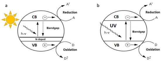The typical band-gap energy of titanium dioxide is between 3–3.2 eV. Thus, UVA radiation (wavelength <400 nm) is needed for its activation. Sunlight radiation just comprises 4–5% of UVA radiation. This means that low performance is expected when natural light is applied. Therefore, to take advantage of the remaining spectrum of sunlight radiation, the visible region, the TiO2 band gap must be reduced. This is usually achieved by using a suitable dopant. Doping appears as a good alternative for changing the activity of TiO2 catalysts through the optoelectrical modification of this material by the introduction of dopants with different energy levels between the conduction and valence band [15]. The applied dopants can be metals, such as noble and transition metals, or nonmetals (N, B, S, F, and C). The noble metals (such as Ag, Au, Pd, and Pt) present some advantages such as the possibility to absorb the visible light due to the surface plasmon resonance [16,17,18], but the high cost associated with these materials should be considered a disadvantage. The transition metals can also enhance their photocatalytic activity. However, their leaching behavior leads to the fast deactivation of the catalyst and constitutes a second source of pollution, requiring the removal of dissolved metals from treated water [3]. Therefore, nonmetals present some advantages compared to the metal dopants. Besides the effective activation of TiO2 in the visible spectrum of sunlight due to the narrowing of the band gap that allows avoiding the recombination phenomenon, the low cost and environmentally-friendly character of this material appear as tempting features [19]. As nonmetal doping elements, some anionic species such as nitrogen, carbon, sulfur, and boron have been studied due to the beneficial advantages of substituting oxygen in a TiO2 lattice and given activity to these catalysts at visible light radiation, maintaining its maximum efficiency [15,20,21]. Among the above-mentioned nonmetals, the most suitable and commonly used is nitrogen. This element can introduce few states at the valence band edge, tuning the optical band gap and acting as superficial donors [15,22]. Moreover, N instead of O in the TiO2 lattice allows the band gap to narrow due to the 2p states of the N atom mixed with O 2p states [23,24]. In fact, it was proved that for both the anatase and rutile phases of TiO2, the N 2p states were located just above the top of the O 2p valence band, which means a red shift of the absorption band edge to the visible region [23]. Therefore, it indicates that nitrogen is the best nonmetal dopant to TiO2, improving the photocatalytic activity at the visible light radiation, which means a low-cost energy source for the degradation of contaminants.