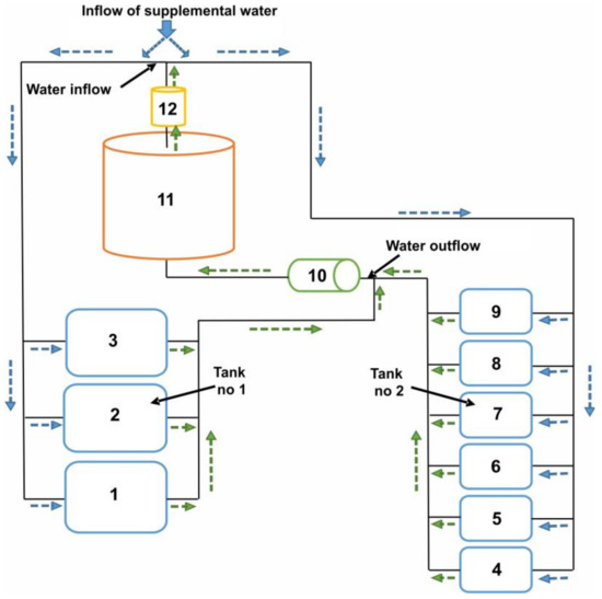 Diagram of the recirculating aquaculture system (RAS) and water sampling sites. Denotations: 1, 2, 3—fish rearing tanks (0.98 m3); 4, 5, 6, 7, 8, 9—fish rearing tanks (0.32 m3); 10—microstrainer; 11—trickling filter; 12—UV lamp.