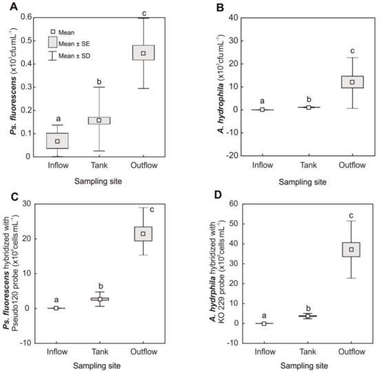 The counts of Pseudomonas fluorescens (A) and Aeromonas hydrophila bacteria (B) determined by a culture-dependent method and the culture-independent technique: bacteria hybridized with Pseudo120 (C) and KO 229 probes (D). The differences in the bacteria counts in water samples collected from the inflow (N = 17), tank (N = 34) and outflow (N = 17) were analyzed with the Tukey multiple comparison test (RM-ANOVA, p < 0.05). Statistically significant differences were depicted by different letters. Denotations: ±SE—standard error, ±SD—standard deviation.
