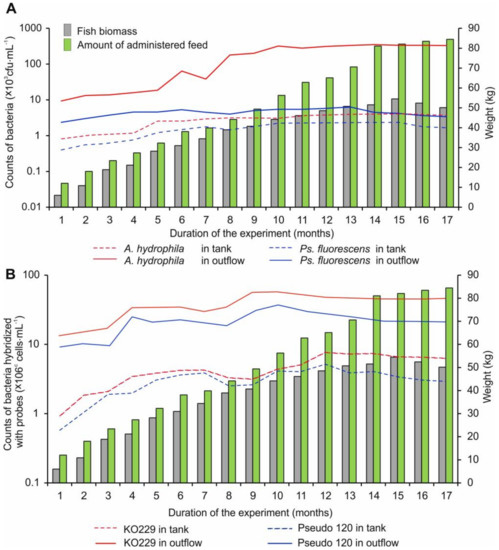 Changes in the counts of Pseudomonas fluorescens and Aeromonas hydrophila determined by a culture-dependent method (A) and a culture-independent method: Peudo120, KO 229 (B) in water samples collected from the fish tank and the outflow relative to cumulative fish biomass and the total amount of feed administered during the intensive rearing of European grayling (Thymallus thymallus L.) broodstock in RAS. Dashed lines represent bacterial counts in the tank, and continuous lines denote Ps. fluorescens and A. hydrophila populations at the outflow.