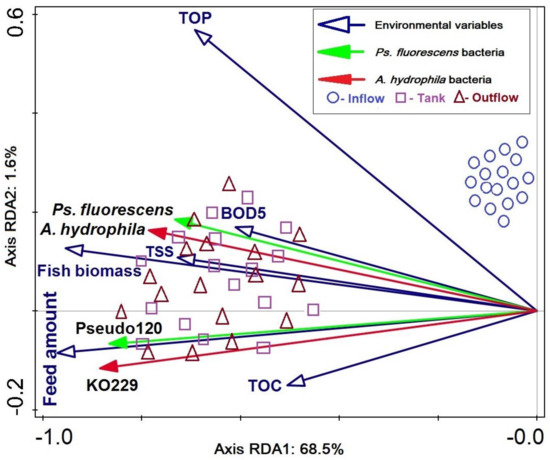 In our study, the positive correlations between Ps. fluorescens and A. hydrophila counts determined by culture-dependent and culture-independent methods versus the amount administered feed, fish biomass, and BOD5, TSS, and TOC concentrations indicate that some factors were influenced mainly by the size of Ps. fluorescens and A. hydrophila populations in the analyzed RAS. The studied bacterial species are capable of metabolising nitrogen and carbon from various sources, and they proliferate most rapidly in the presence of readily oxidizable organic matter from fish feed which is utilized with 80–90% efficiency [18,67]. These results indicate that intensively farmed European graylings increase the abundance of culturable and non-culturable potentially pathogenic Ps. fluorescens and A. hydrophila in RAS.