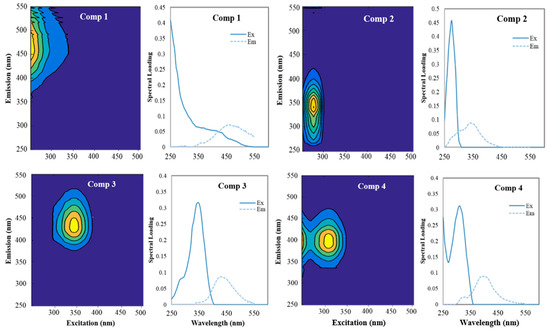 A Pearson correlation coefficient was computed to assess the relationship between DOC concentrations and PARAFAC components. Overall, a significant correlation was identified between DOC concentration and C1 (p = 0.027) and C4 (p = 0.005) components for Fmax intensities of effluent samples. This observation suggests that an increase in DOC was possibly due to increased humic substances [28] as component C1 and C4 are identified to consist of humic-like substances.