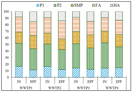 Contour plots of the four components derived from the excitation-emission matrices (EEM) dataset after PARAFAC analysis (Left), and line plots showing spectral loadings on four components (Right). The relative abundances of five regions identified based on the method of Chen, et al. [12] are summarised in Figure 2. The results showed higher percentages of protein compounds (P1, P2 and SMP) as compared to organic compounds (HA and FA), and these findings are comparable to others that supported a higher proportion of proteins in wastewater [29,30].