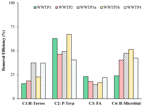 The removal efficiency (%) of fluorescence excitation-emission (F-EEM) components derived from EEM datasets in the studied WWTPs. C1: H-Terres (humic acid-like terrestrial); C2: P-Tryp (protein-tryptophan), C3: FA (Fulvic Acid-like), C4: H-microbial.