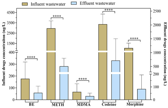 All the compounds (DOA) were detectable in influent and effluent wastewater samples ranging from a few ng/L to µg/L. Codeine and METH had the highest concentrations of all the examined drugs in all WWTPs. Concentration profiles of all the DOA are reported in Figure 4 and presented as the average of four WWTPs during the sampling period (4 months × 7 days = 28 samples/WWTP). There was a significant decrease in the concentrations of all the targeted DOA in effluent samples after the treatment processes; however, their presence in effluents proves they are only partially eliminated during the wastewater treatment process. Thus, the removal rate of targeted DOA was estimated by evaluating the relative concentration in effluent versus influent wastewater.