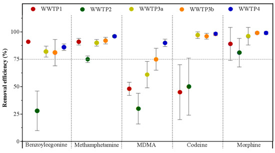 Varying removal efficiencies were observed for the DOA in the WWTPs depending on the secondary treatment process and physical-chemical properties of drugs [13]. For example, differences in removal efficiency were observed for BE (91% vs. 28%) and MDMA (40% vs. 30%) in WWTP1 and WWTP2, respectively, operating with two different secondary treatment processes. Figure 5 summarises the removal efficiencies (mean ± SD) of the DOA with respect to WWTP during the sampling period. The variation in removal efficiency can be associated with several factors, including WWTP operational conditions (hydraulic or sludge retention time), influent load or drugs type [13,32,33]. A relationship was determined between removal efficiencies and DOA load, and it was found that BE, METH and codeine removal was significantly correlated with their respective drug loads (p < 0.01).