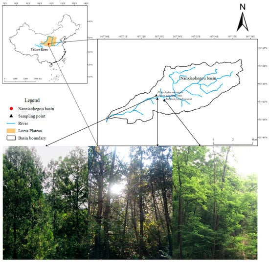 Location of Nanxiaohegou sub-basin in China; inset shows the location of three types of planted forests.