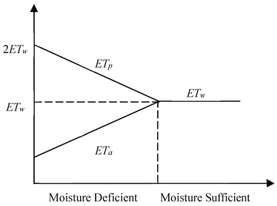 Utilizing an analysis based on energy balance, Bouchet [14] proposed a theory that potential evapotranspiration (ETp) and actual evapotranspiration (ETa) are strongly coupled through land-atmosphere feedbacks at large homogeneous surfaces, with minimal advection of heat and moisture. The relationship has come to be known as the complementary relationship between ETa and ETp. When the moisture at the surface is sufficient, ETa is equal to ETp, which is the wet-environment evapotranspiration ETw. If the soil moisture is reduced, then ETa will decline; thus, the energy that is used for evapotranspiration will become excessive. If there is no advection, then the energy will remain unchanged when evapotranspiration is reduced. Meanwhile, the reduced ETa will change the temperature and humidity in the area, so the remaining energy will increase ETp. The increase of ETp should be equal to the remaining energy. Figure 2 shows the schematic representation of the complementary relationship in regional evapotranspiration. The following equation indicates the relationship between ETa and ETp:
