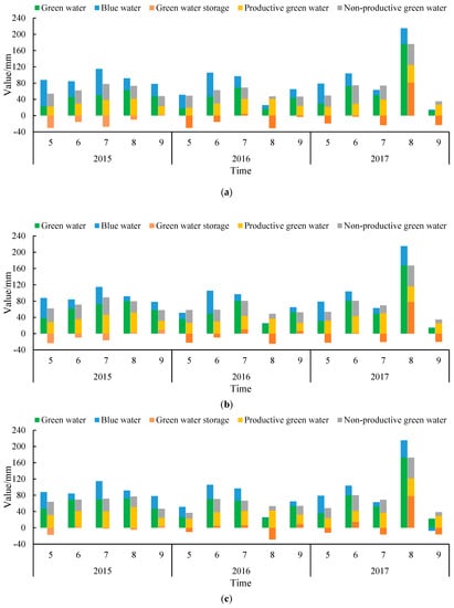 Precipitation is the only source of green water in the studied area. The average precipitation between 1954 and 2017 was 104.6 mm and 90.5 mm for August and September, respectively. However, the precipitation in these two months was 215.0 mm and 14.7 mm in 2017, which significantly differed from the average value. This significant variation from average precipitation somewhat influenced the amount of green water resource. In August 2017, when the precipitation was significantly higher than the average, the soil was unable to store more water over a short time, and thus most of the precipitation was converted to blue water, which would not make a significant contribution to an increase in green water storage. On the other hand, in September 2017, when the precipitation was much lower than the average, there was an ongoing consumption of green water storage due to plant transpiration and soil evaporation. According to the precipitation data between 2015 and 2017, the precipitation of 2015 was normal, while it was drier than normal in 2016 and wetter in 2017. Therefore, the temporal change in green water during the growing season of 2015 could reflect the general rule of green water change in this area; i.e., the productive green water increases first and then drops between May and September, and the non-productive green water changes in an opposite way.