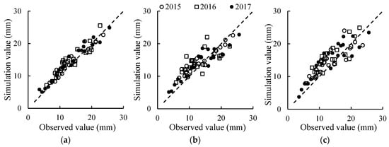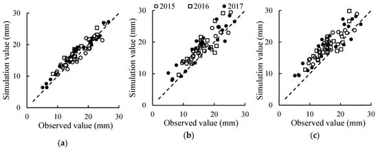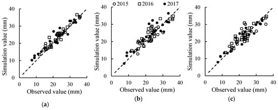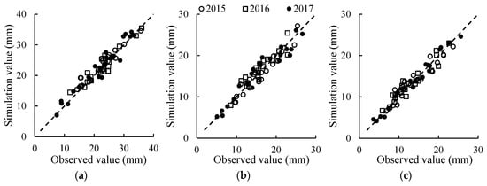 Scatter plot of simulated values of green water fluxes of (a) Robinia pseudoacacia, (b) Platycladus orientalis, and (c) Pinus tabulaeformis based on the CRAE model with calibrated parameters and green water fluxes derived from the water balance approach between 2015 and 2017.