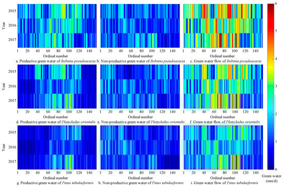 The R. pseudoacacia had the productive green water, non-productive green water, and green water flux during the growing season between 2015 and 2017, followed by the P. orientalis and the P. tabulaeformis forests. Moreover, the productive green water of the P. orientalis from Day 1 to 36 and the P. tabulaeformis from Day 1 to 63 of the studied period was significantly lower than the non-productive green water. The variation in productive green water that was caused by the rapid change in precipitation differs from each other for the three planted forests, with the lowest variation in productive green water occurring in the R. pseudoacacia. This finding indicates that the change of meteorological conditions had the smallest impact on the transpiration of R. pseudoacacia in the studied area.