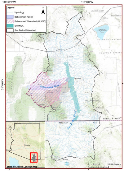 Location map depicting the San Pedro Watershed, in the State of Arizona and the US–Mexico border, cities, land ownership, and the Babocomari HUC10 sub-watershed.